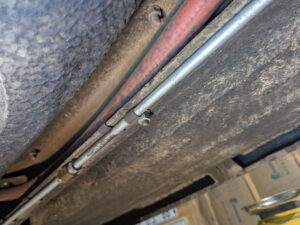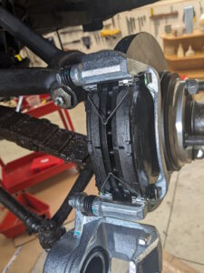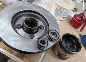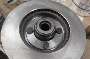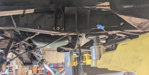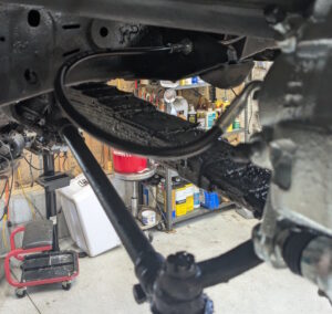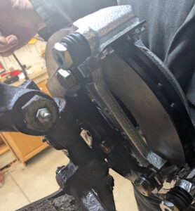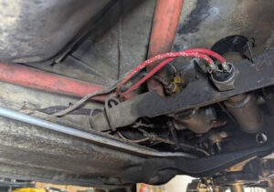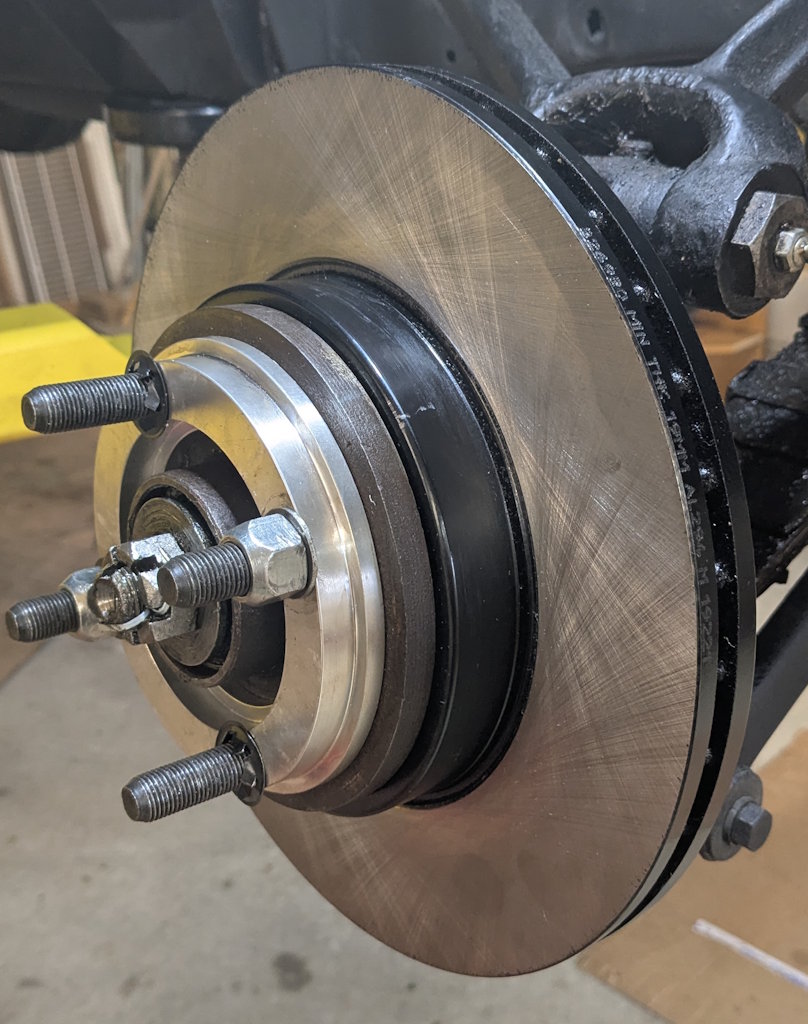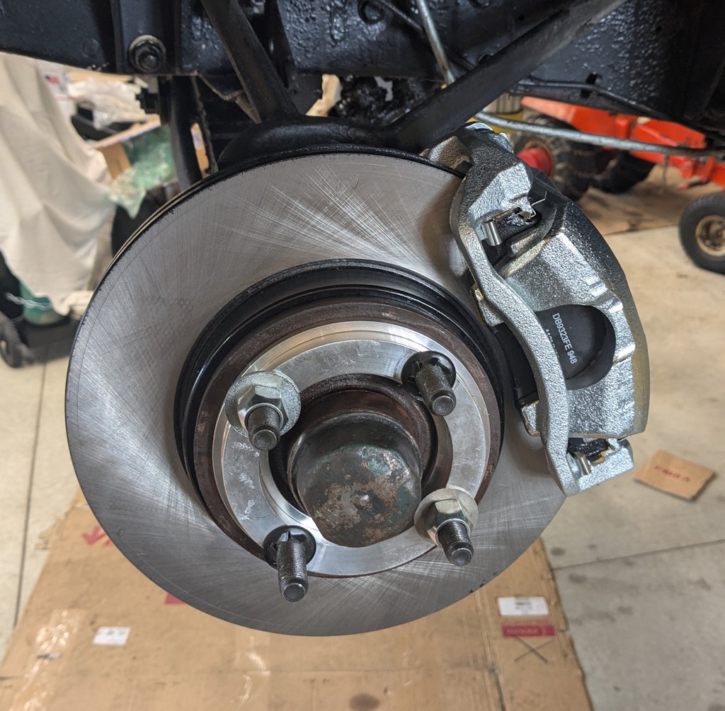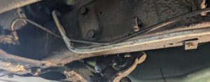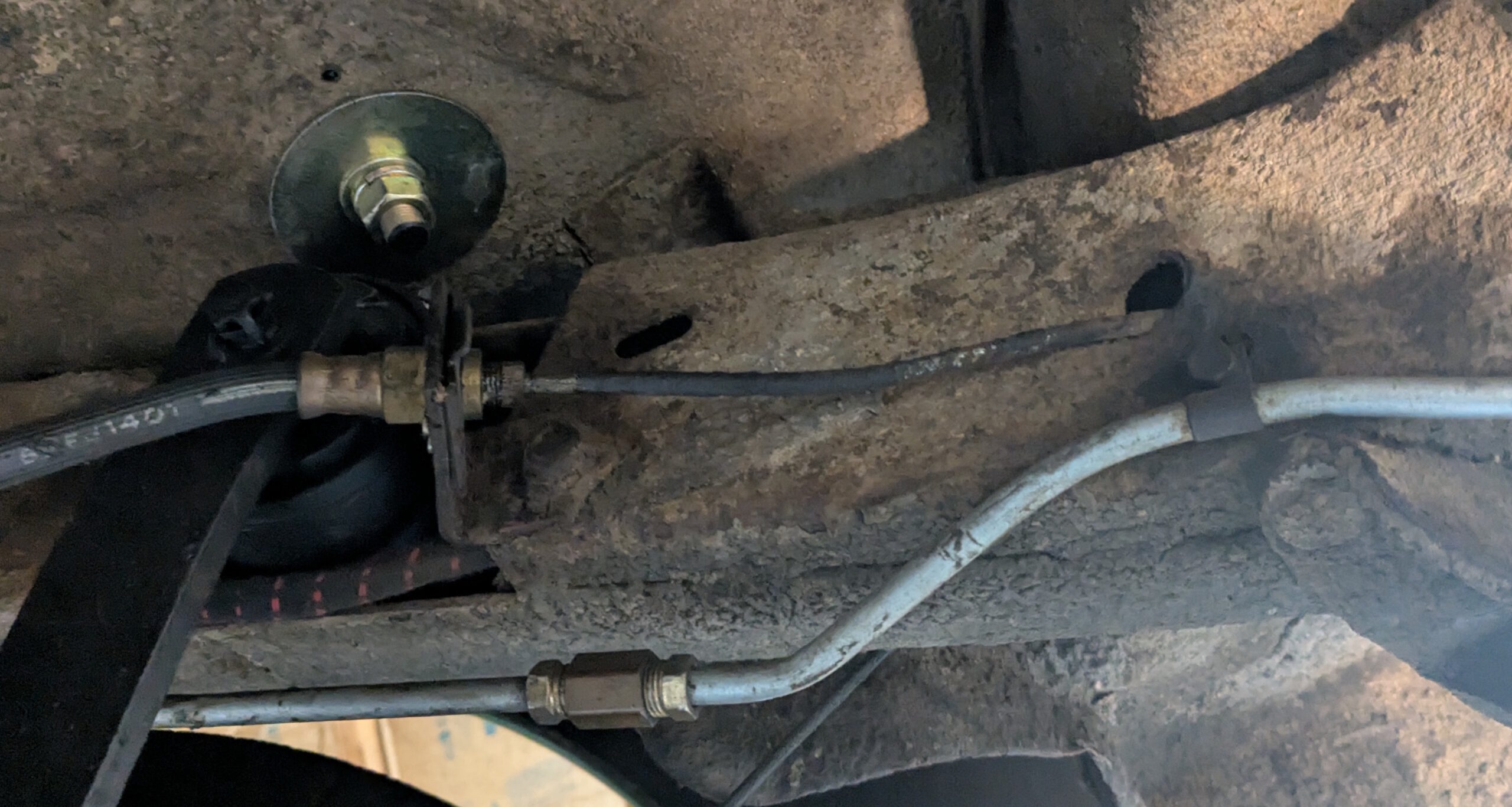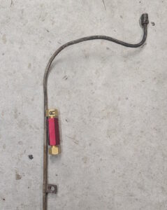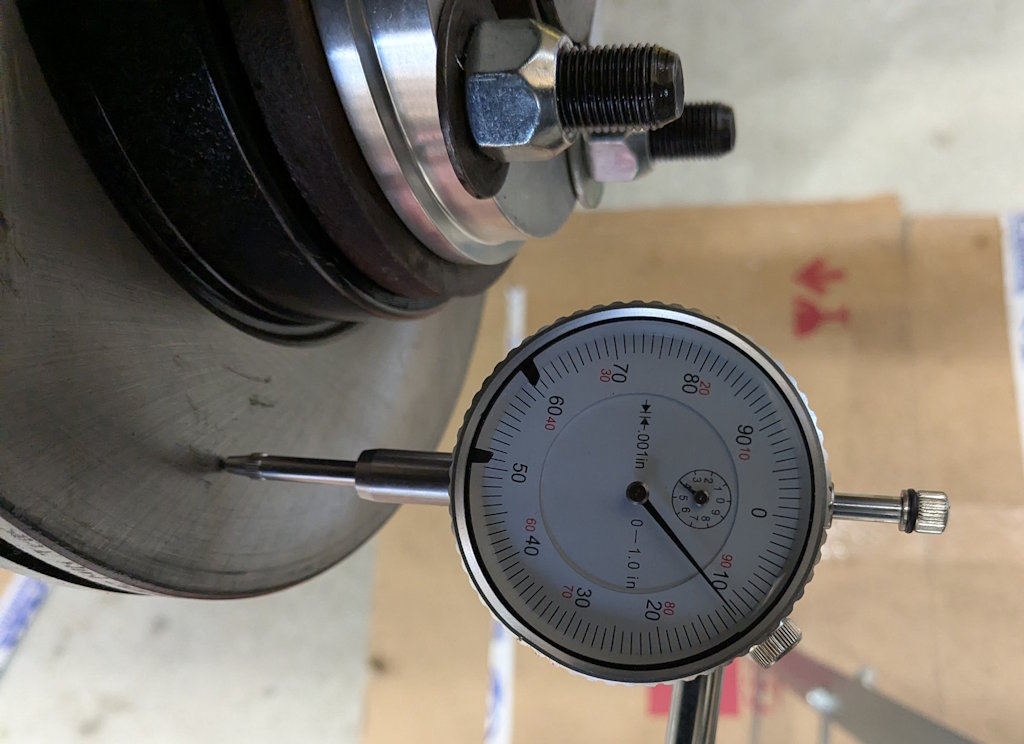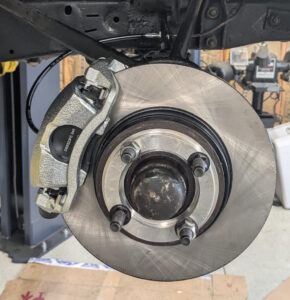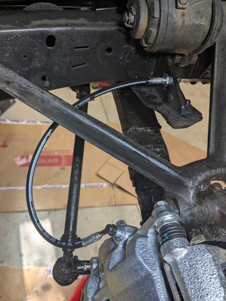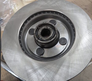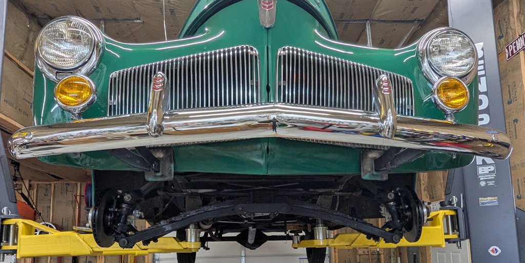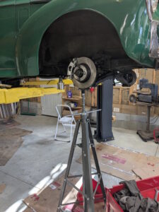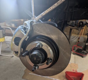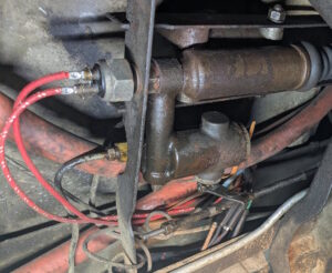 I am going to start this off with the hero shot of the front discs installed. Looks really good, but here is how we got here.First I needed to test fit the driver’s side caliper. This went just like the passenger side with a couple of snags. The first “problem” was I could not get the bolt in for the caliper rail. I started to get concerned then I remembered the front wheels on cars actually turn. That fixed the “problem”.The next problem was that the caliper rails hit the rotor. I used two washers just like the passenger side but obviously this side is different. This does not surpise me a lot. With no CNC machines every machining operation at Studebaker required either a manual operation or custom mechanical tooling. The spacing between the machined flats on the spindle and the face of the spindle was NOT a critical dimension, so they did not worry about it. Going to one washer centred it perfectly. More good news! When I checked the runout on the driver’s side, it was only around 0.010″, which is a lot better than the passenger side. I am almost ready to assemble the brakes “for real”. First, the passenger-side bracket was hitting slightly on the spindle, so I filed it down and touched up the paint. I assembled the bracket to this spindle using red Lock-Tite and the self-locking nuts that came with the kit. I torqued them to 50 ft-lbs. I put washers under the nuts because I didn’t want the nuts to damage the face of the spindle. I could not use lock washers because the bolts were too short. I don’t think it will be a problem. I also sprayed the spindle face with some anti-corrosion goop. Time to pack the bearings. This is messy and hard to take a picture with grease all over my hands. Rear bearing installed.Then I tapped the new grease seal in. I also cleaned the rotor face and put the anti-corrosion goop around the hub.The rotor was installed with a new cotter pin. The kit came with those two clips to hold the “stack” of parts together when the lug nuts are removed. Then the caliper rails bolt up to the bracket. The kit instructions said to use red Lock-Tite for this, but I used blue so I can remove the rotor without using heat. It will be fine. I lubed up the rails and caliper with brake lube.All bolted up. This looks good. Then I got to take it apart again to put the springs in. That was bad enough, but then I did the same thing on the other side!The driver’s side went together exactly like the passenger’s side, including forgetting the damn springs.The bleeder screws are 8mm x 1.5. I will probably try to find a set of speed bleeders in this size. Mechanicals are done, time to move on to the hydraulics. The kit came with these new flexible brake lines. I can only do the passenger’s side now since I need to mess with the hard lines on the driver’s side. It took some fiddling, but I eventually came up with this routing for the line.Here is how the line meets the caliper. The little “ears” on the top and bottom were probably intended to go around the hard line on the banjo union, but I could not make that work out. The focus is bad, but here is the other end clipped in place and with the brake line attached.I wanted to make sure the hose cleared the suspension, so I used a jack stand to raise it to ride height. I then turned the wheels stop to stop and checked for any problems. This is as close as it came to anything.Now the passenger’s side is complete! Looks really good. Next, I went under the car. The master cylinder needs to come out for rebuilding and modification. In addition, I need to put two residual pressure valves in the front and rear brake lines somewhere. Here is what it all looks like to start with. The front brake line comes out of the back and loops over to the frame rail to run backwards. The front brake line comes out of the top and goes over the orange heater hose, then runs forwardHere is another view. What looks like a leak is actually some penetrating oil I put on the fittings. It is not leaking. Here the brake lines have been removed, as well as the brake light switch. That and a single bolt forward are all that hold the master cylinder in. I removed the cotter pins holding the brake rod and hill holder rod, then removed the master cylinder. The brake rod is just being held on by the rubber boot at this point.The front brake line is snarled up with the fuel line. With a little wiggling I was able to get the front part of the brake line hanging loose. The blue tape is marking where I think the residual pressure valve will go. At this point, I was stuck. I could not get the line the rest of the way out. So, I cut it at the taped mark.The cut line came right out. Here is the pressure valve next to the cut line. I will just need to trim the line to length and put new flare fittings on the ends.The rear line runs inside the frame rail. That clamp holding the fuel line has an identical clamp on the inside using the same bolt. The wiring harness and heater hose run in front of the brake line.At the arch over the rear axle the line goes through the frame rail and connects to the rear flex line. I figured it was worth a shot to remove the line. I popped off the clips holding the wiring harness and slid it out of the way. Then I disconnected the clamps and the flare fitting at the rear. To my surprise the line slid right out.This is as easy as a brake line gets. Front is to the right. I am trying to decide where to put the rear residual pressure valve. I like this spot, except it is very close to the fitting and in a crowded spot.This is another option. I would need to bend the line a bit to separate it from the frame rail. My major concern here is that the valve will be hard to see and check for leaks. I will need to decide later since I am out of time for tonight. I did buy some fittings and an 8″ length of brake line. I should be able to make something work from that.