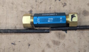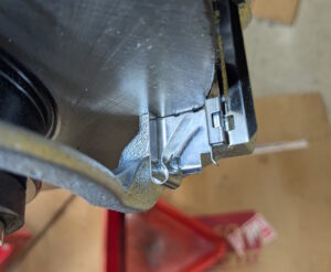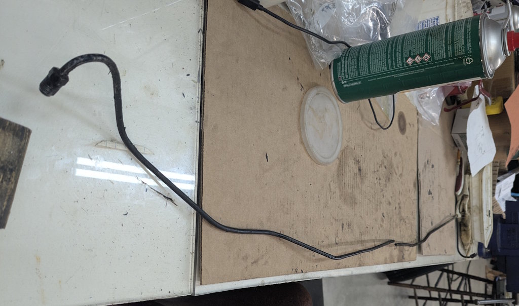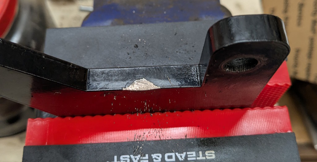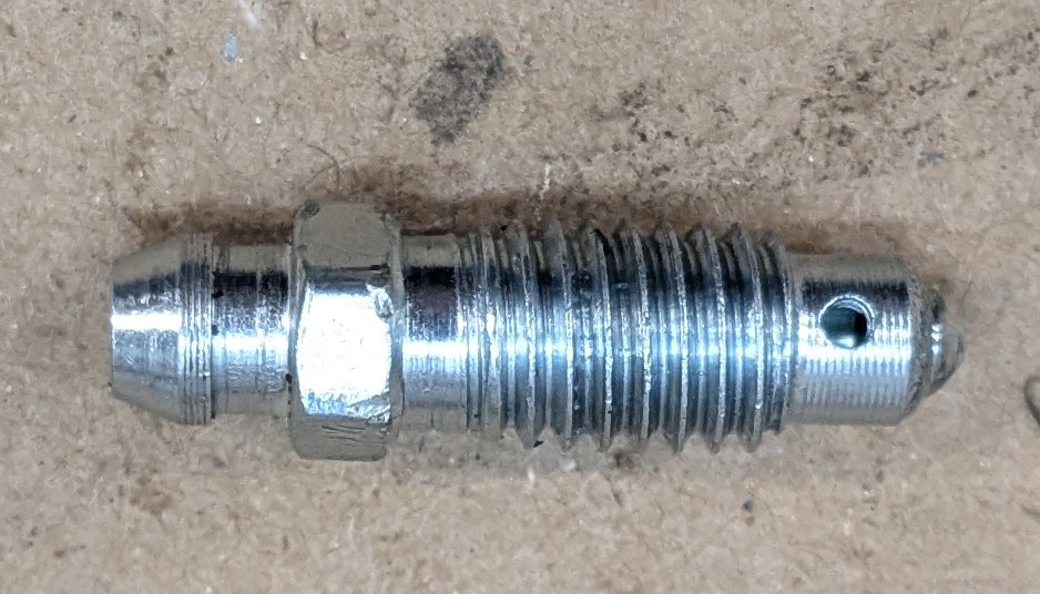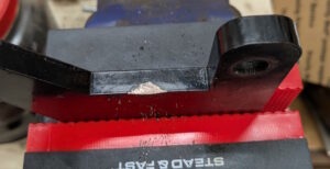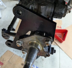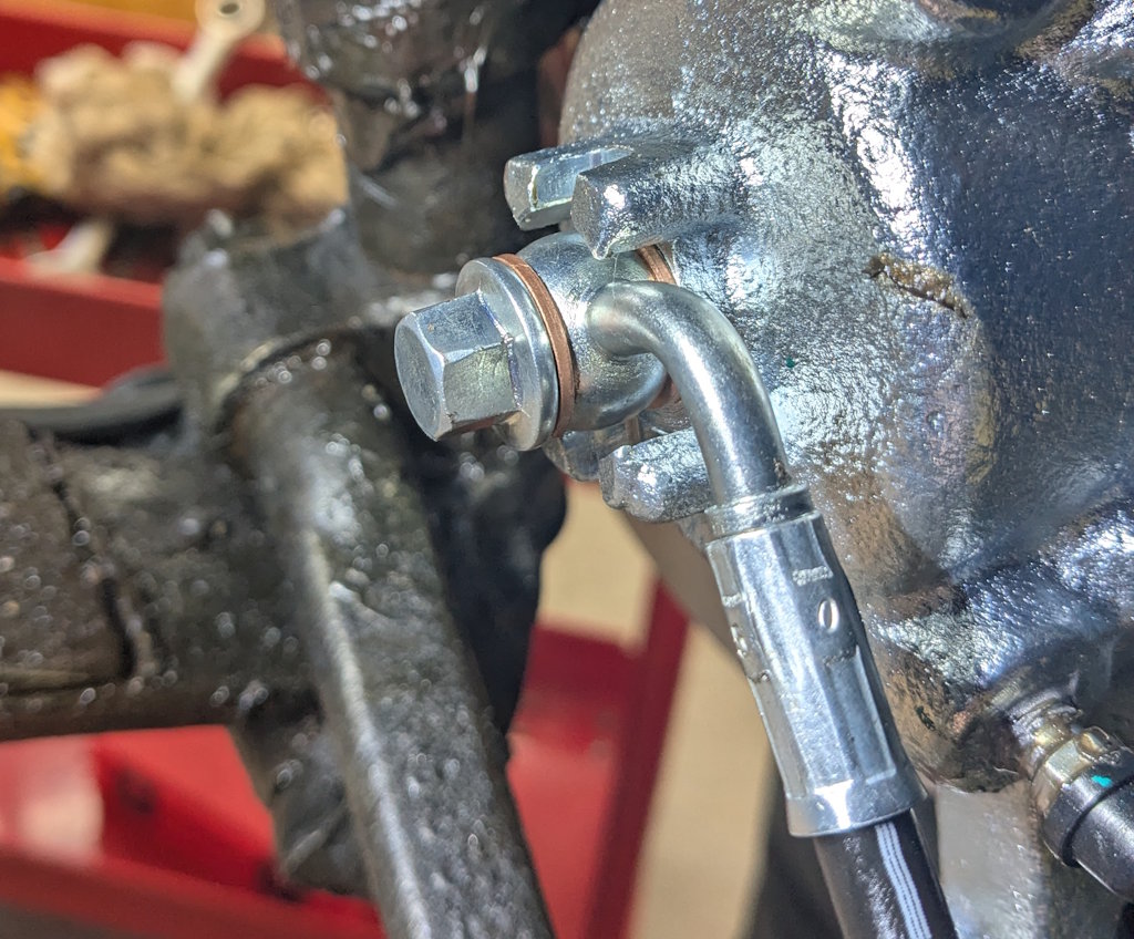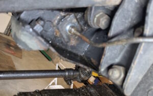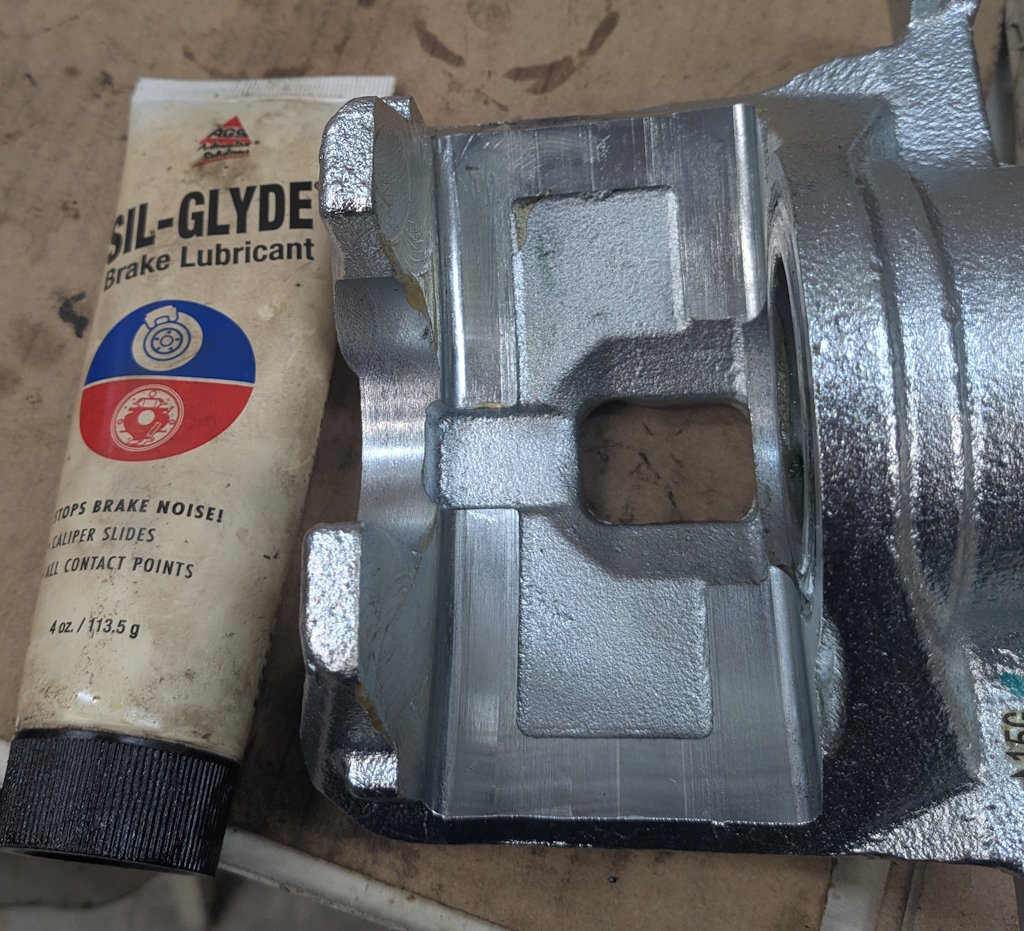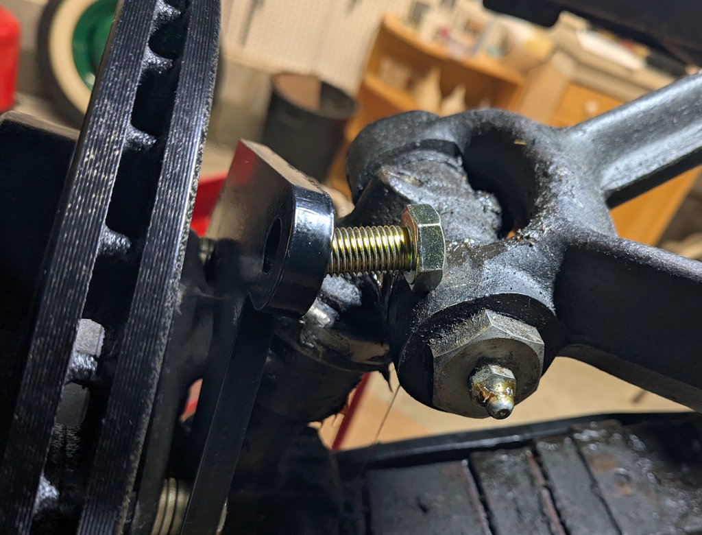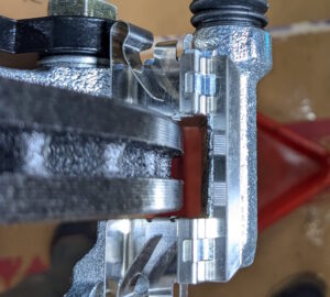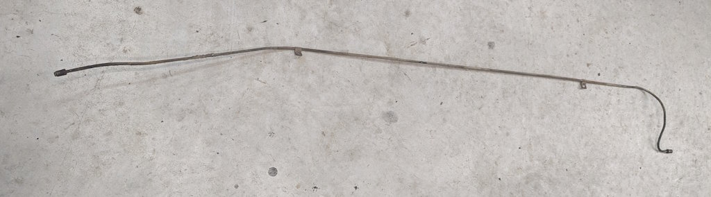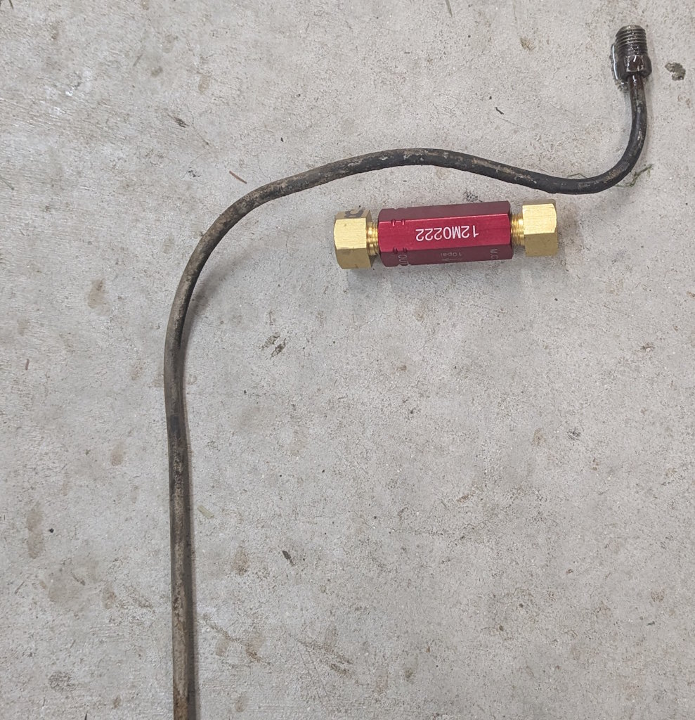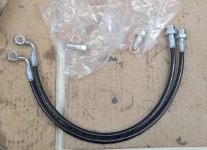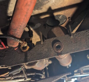 I am going to start this off with the hero shot of the front discs installed. Looks really good, but here is how we got here.First I needed to test fit the driver’s side caliper. This went just like the passenger side with a couple of snags. The first “problem” was I could not get the bolt in for the caliper rail. I started to get concerned then I remembered the front wheels on cars actually turn. That fixed the “problem”.The next problem was that the caliper rails hit the rotor. I used two washers just like the passenger side but obviously this side is different. This does not surpise me a lot. With no CNC machines every machining operation at Studebaker required either a manual operation or custom mechanical tooling. The spacing between the machined flats on the spindle and the face of the spindle was NOT a critical dimension, so they did not worry about it. Going to one washer centred it perfectly. More good news! When I checked the runout on the driver’s side, it was only around 0.010″, which is a lot better than the passenger side. I am almost ready to assemble the brakes “for real”. First, the passenger-side bracket was hitting slightly on the spindle, so I filed it down and touched up the paint. I assembled the bracket to this spindle using red Lock-Tite and the self-locking nuts that came with the kit. I torqued them to 50 ft-lbs. I put washers under the nuts because I didn’t want the nuts to damage the face of the spindle. I could not use lock washers because the bolts were too short. I don’t think it will be a problem. I also sprayed the spindle face with some anti-corrosion goop. Time to pack the bearings. This is messy and hard to take a picture with grease all over my hands. Rear bearing installed.Then I tapped the new grease seal in. I also cleaned the rotor face and put the anti-corrosion goop around the hub.The rotor was installed with a new cotter pin. The kit came with those two clips to hold the “stack” of parts together when the lug nuts are removed. Then the caliper rails bolt up to the bracket. The kit instructions said to use red Lock-Tite for this, but I used blue so I can remove the rotor without using heat. It will be fine. I lubed up the rails and caliper with brake lube.All bolted up. This looks good. Then I got to take it apart again to put the springs in. That was bad enough, but then I did the same thing on the other side!The driver’s side went together exactly like the passenger’s side, including forgetting the damn springs.The bleeder screws are 8mm x 1.5. I will probably try to find a set of speed bleeders in this size. Mechanicals are done, time to move on to the hydraulics. The kit came with these new flexible brake lines. I can only do the passenger’s side now since I need to mess with the hard lines on the driver’s side. It took some fiddling, but I eventually came up with this routing for the line.Here is how the line meets the caliper. The little “ears” on the top and bottom were probably intended to go around the hard line on the banjo union, but I could not make that work out. The focus is bad, but here is the other end clipped in place and with the brake line attached.I wanted to make sure the hose cleared the suspension, so I used a jack stand to raise it to ride height. I then turned the wheels stop to stop and checked for any problems. This is as close as it came to anything.Now the passenger’s side is complete! Looks really good. Next, I went under the car. The master cylinder needs to come out for rebuilding and modification. In addition, I need to put two residual pressure valves in the front and rear brake lines somewhere. Here is what it all looks like to start with. The front brake line comes out of the back and loops over to the frame rail to run backwards. The front brake line comes out of the top and goes over the orange heater hose, then runs forwardHere is another view. What looks like a leak is actually some penetrating oil I put on the fittings. It is not leaking. Here the brake lines have been removed, as well as the brake light switch. That and a single bolt forward are all that hold the master cylinder in. I removed the cotter pins holding the brake rod and hill holder rod, then removed the master cylinder. The brake rod is just being held on by the rubber boot at this point.The front brake line is snarled up with the fuel line. With a little wiggling I was able to get the front part of the brake line hanging loose. The blue tape is marking where I think the residual pressure valve will go. At this point, I was stuck. I could not get the line the rest of the way out. So, I cut it at the taped mark.The cut line came right out. Here is the pressure valve next to the cut line. I will just need to trim the line to length and put new flare fittings on the ends.The rear line runs inside the frame rail. That clamp holding the fuel line has an identical clamp on the inside using the same bolt. The wiring harness and heater hose run in front of the brake line.At the arch over the rear axle the line goes through the frame rail and connects to the rear flex line. I figured it was worth a shot to remove the line. I popped off the clips holding the wiring harness and slid it out of the way. Then I disconnected the clamps and the flare fitting at the rear. To my surprise the line slid right out.This is as easy as a brake line gets. Front is to the right. I am trying to decide where to put the rear residual pressure valve. I like this spot, except it is very close to the fitting and in a crowded spot.This is another option. I would need to bend the line a bit to separate it from the frame rail. My major concern here is that the valve will be hard to see and check for leaks. I will need to decide later since I am out of time for tonight. I did buy some fittings and an 8″ length of brake line. I should be able to make something work from that.
