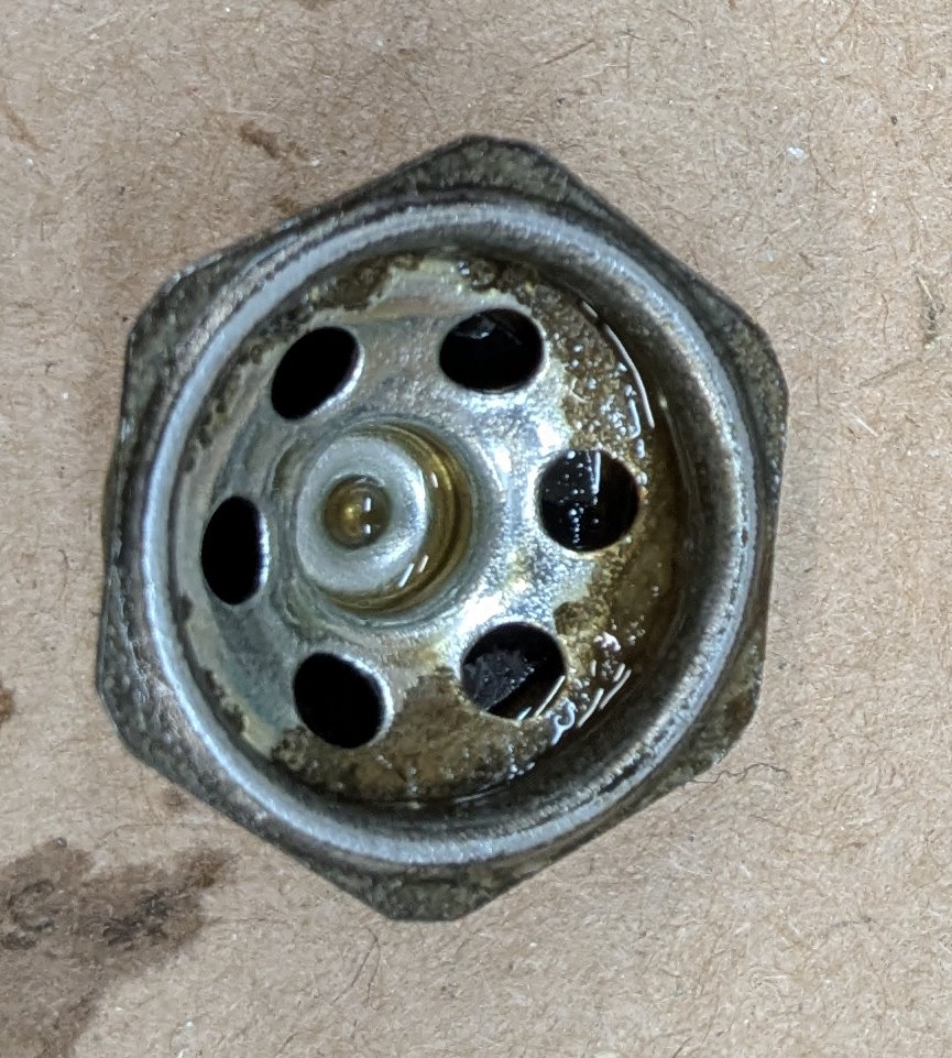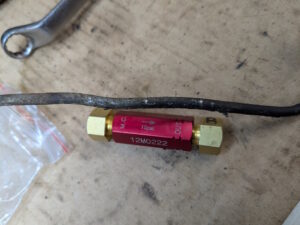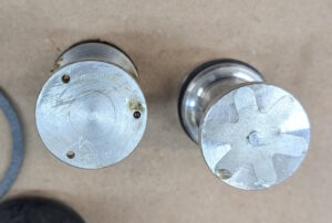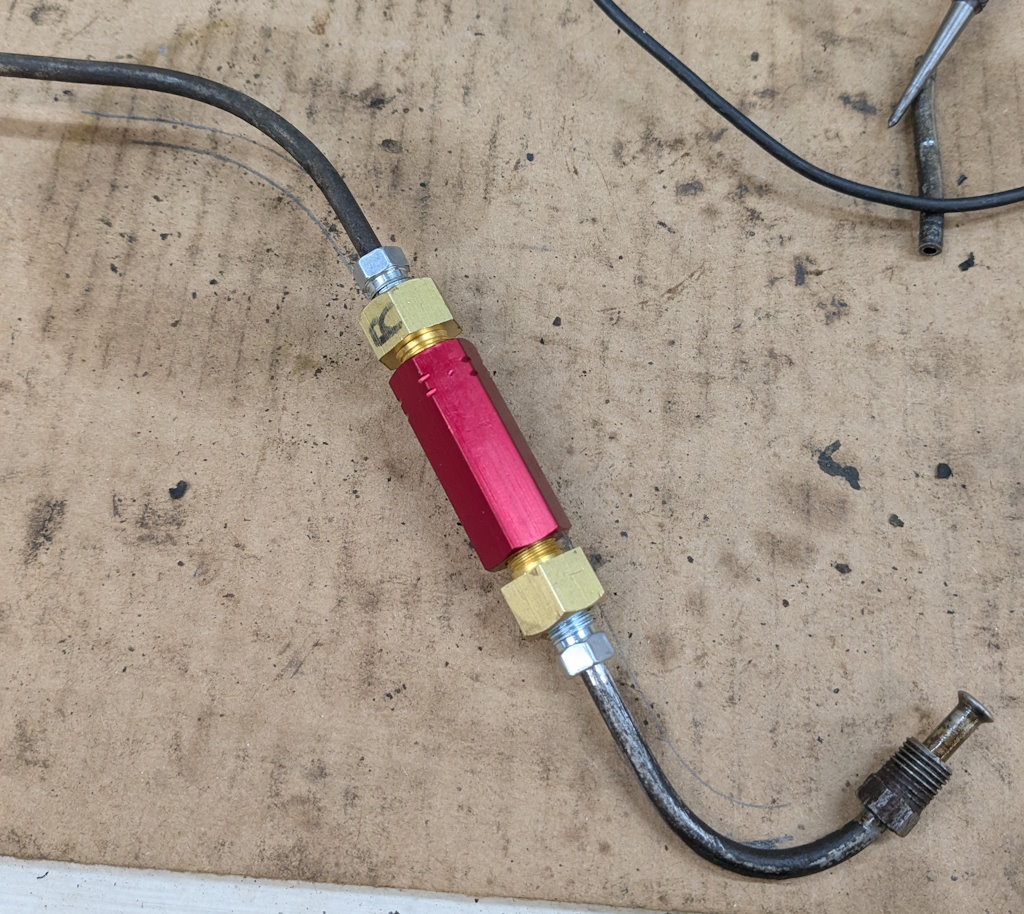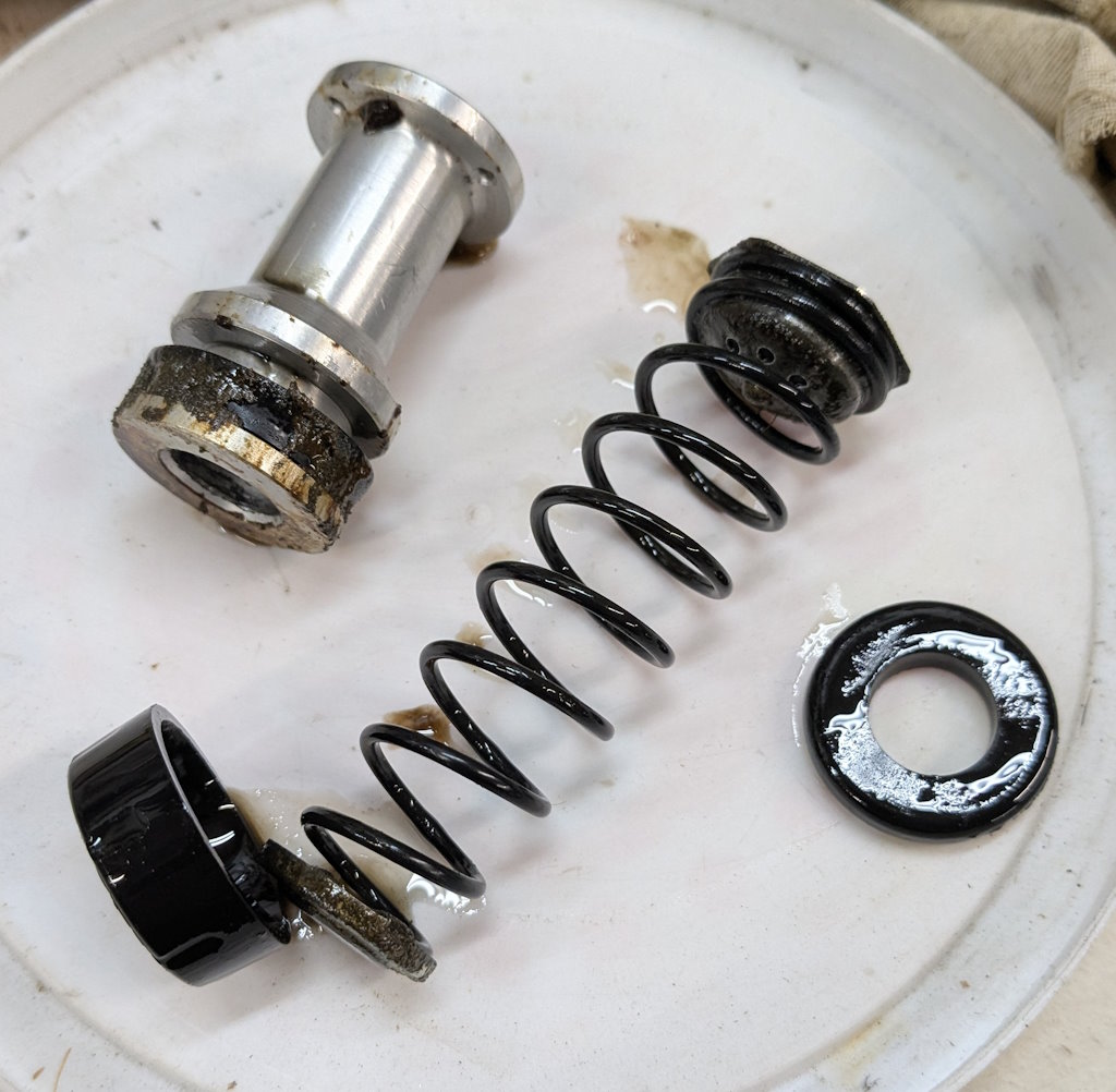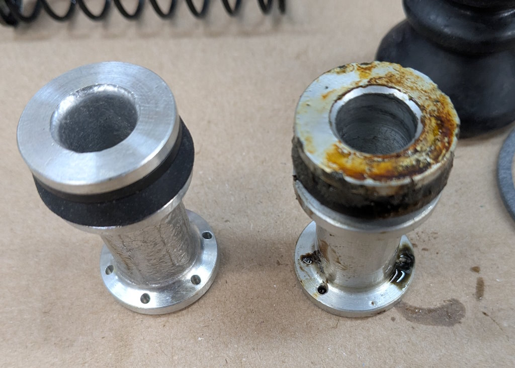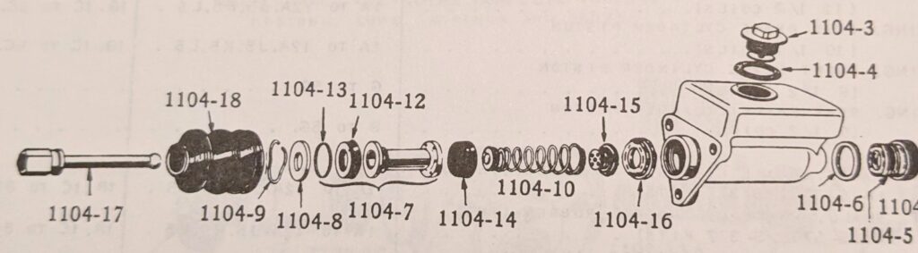 I need to fit the inline residual pressure valves into the existing brake lines. I measured carefully and did the math for the cuts. Then measured again, did the math again, and got a different answer. This is a classic measure twice, cut once situation. You can usually tweak a too-long brake line to fit, but nothing will help a too-short line. These scratch marks are my final answer. The middle one just marks the center. The outer ones are where I cut.I am going to put double-flares on these. The existing ends on the lines appear to be single flares, but the fittings on the pressure valves look to be designed for double flares. After cutting the line, it needs to be deburred. Then we are ready to flare. The first step is to put the fitting on the line. The second step is to make sure the fitting is facing the right way. The third step is to have the tube sticking out of the clamp by the width of the base of the 3/16″ die (these are 3/16″ lines).Fourth step is to check that the fitting is on the line again. The fifth step is to put the die into the end of the tube. I like to put a little oil on the face of the die.Sixth step is to put the press yoke on, centered on the die. The seventh step is to check that the fitting is on the line one last time. I am serious about this. If I do 10 of these, I will forget at least once. Squish it down. If you forgot the fitting, it is too late now. Finally, remove the die and squish it again with the press.And boom goes the dynamite! Three more to go!Here is what the front brake line looks like with the pressure valve loosely installed. Yes, this is the wrong valve, the 2 lbs valve needs to be here. I just had this one handy. I elected to put the valve in the rear line close to the master cylinder. Here is what that looks like. If you look closely, I traced the original line on the cardboard to make sure I got the length right. I think it worked out well. The short end is actually way too short to bend. But this was bent already, so I can get away with it.I reinstalled both lines. I am sure they will need some tweaking, so I did not clamp or clip anything in place yet. Now it is time to rebuild the master cylinder. To do this, push the piston in (I use a big Phillips screwdriver), then pop the spring out with a screwdriver. Then carefully release the spring pressure.Then this happens. If the MC is corroded or contaminated, the piston may stick. In that case, put a rag or something over it, because it will launch itself across the room or into your face. It helps to drain the fluid out first. I made a big mess on the floor because I failed to do this.Here are the internal parts of the master cylinder. I last rebuilt this thing almost exactly 8 years ago. The parts are still in decent shape. You can see some corrosion damage on the aluminum piston, but all in all, it held up well. Here is an exploded diagram from the parts book to orient you. This has some parts that are not in my master cylinder.Brake fluid absorbs water over time and eventually will start causing corrosion inside the brake system. I change the brake fluid every couple of years, and that seems to have paid off. The bore looks very good. Those particles in there are drops of brake cleaner, not debris of any kind.Now here is where things got strange. I purchased this kit from the same vendor I bought the last two from (admittedly 8 and over 20 years ago). But this one is different. It did not include a new spring or the rubber washer that goes at the bottom of the piston bore (1104-10 and 1104-16 in the diagram). And the piston does not have any holes in it. Every other piston I have ever seen has these little holes in the face. I have no idea what they are for.