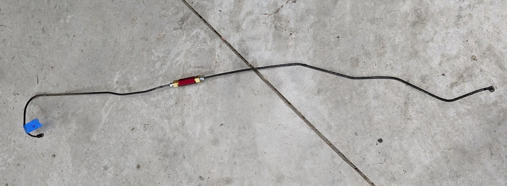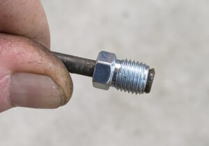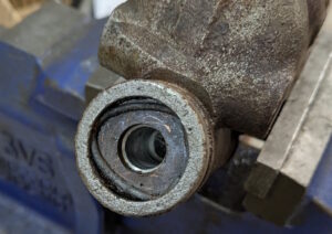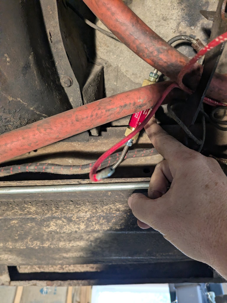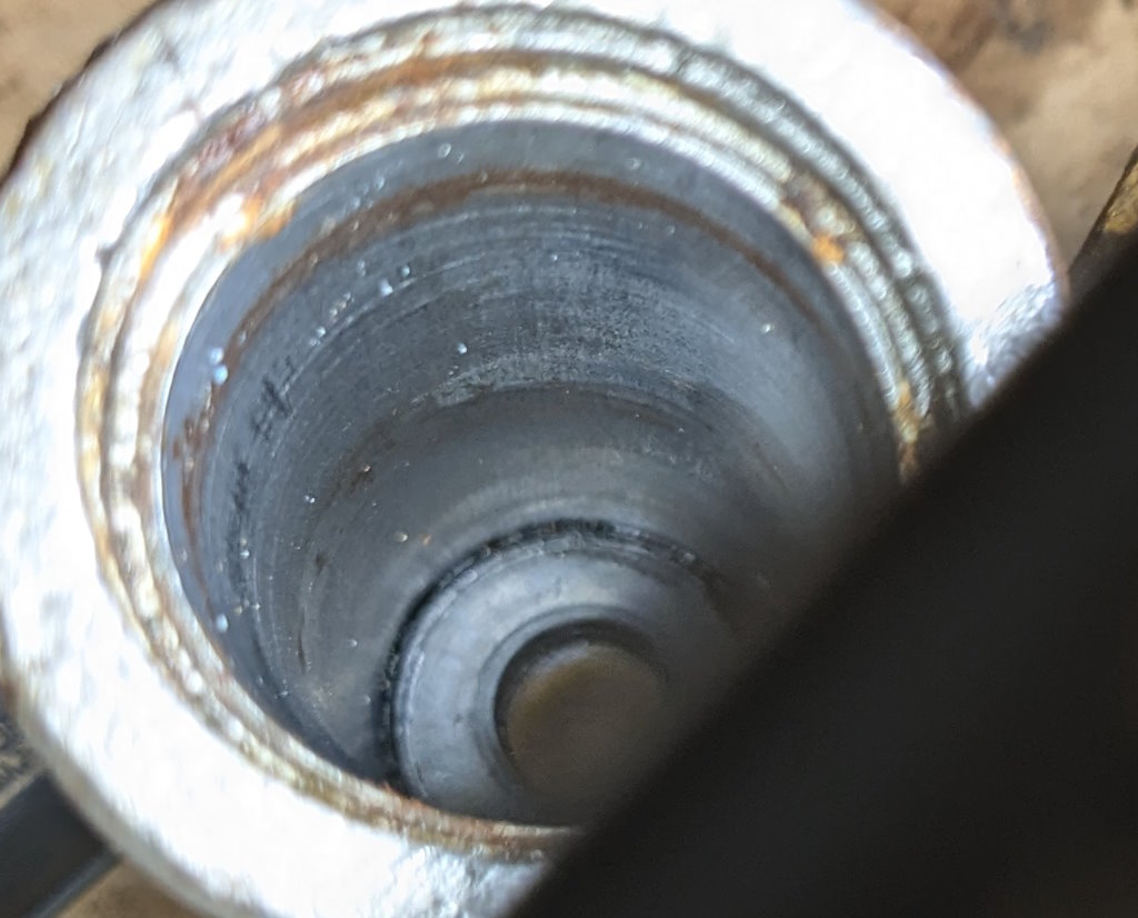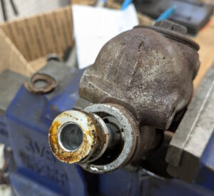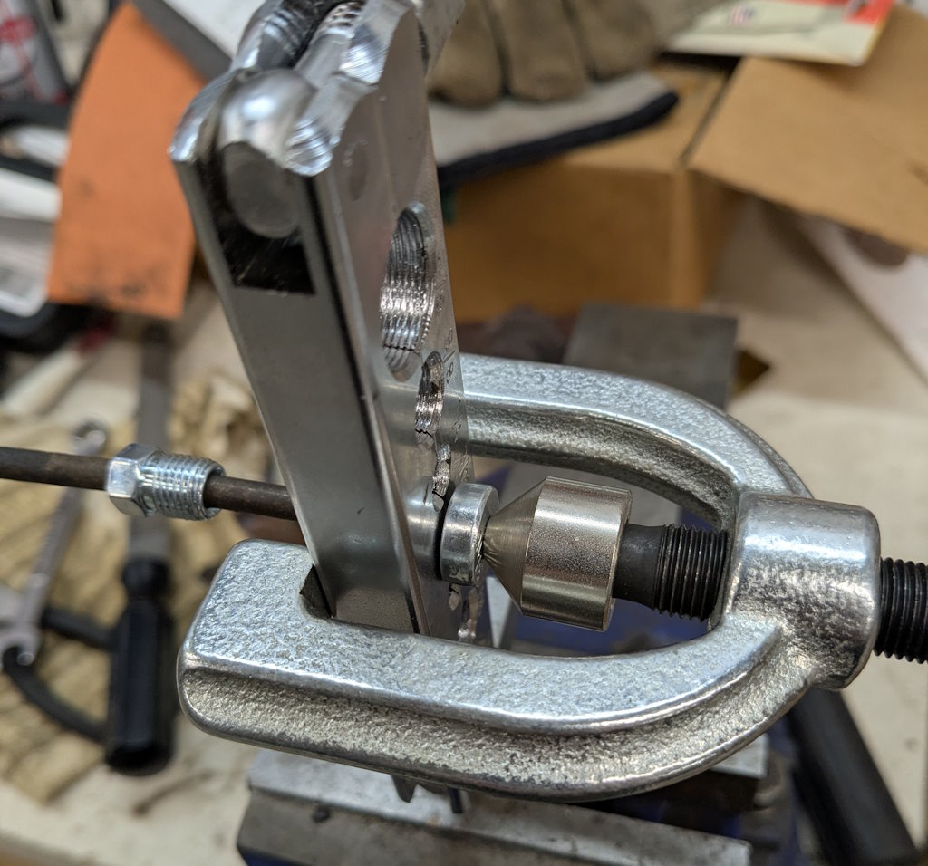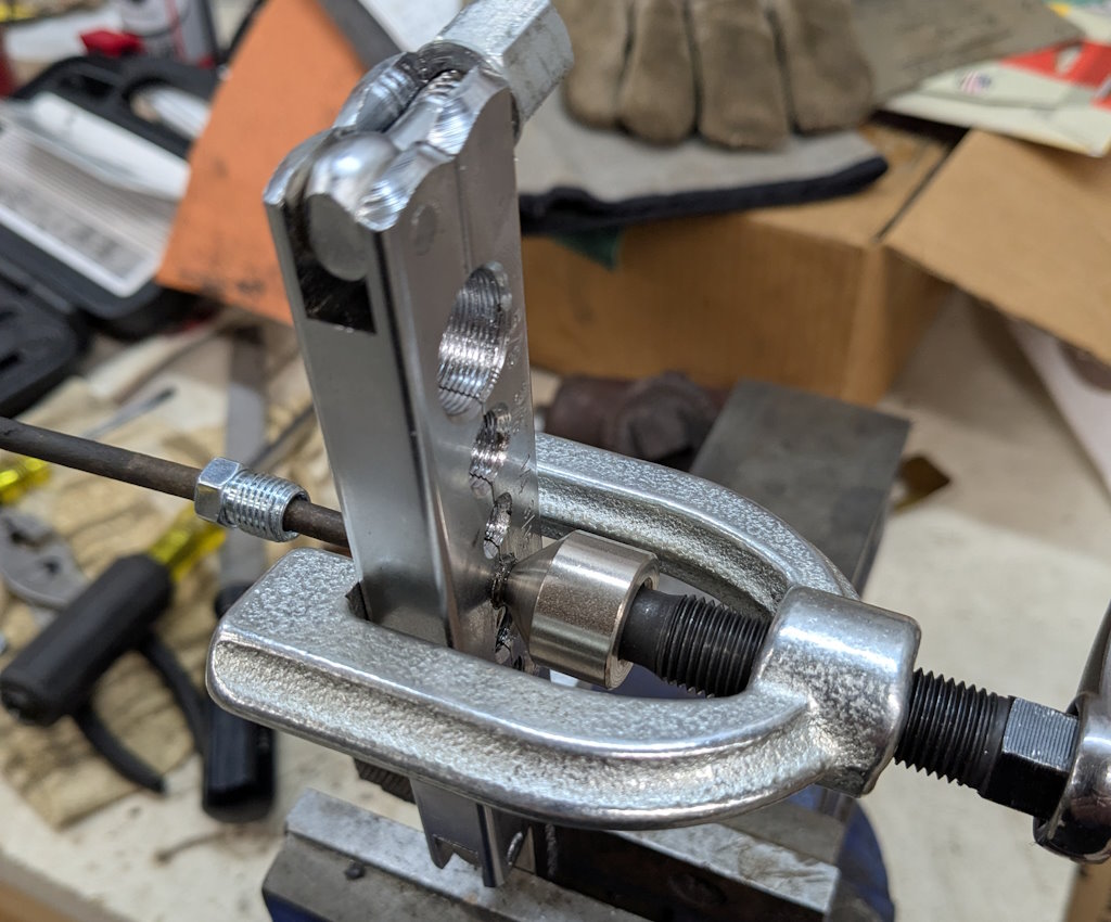 I need to fit the inline residual pressure valves into the existing brake lines. I measured carefully and did the math for the cuts. Then measured again, did the math again, and got a different answer. This is a classic measure twice, cut once situation. You can usually tweak a too-long brake line to fit, but nothing will help a too-short line. These scratch marks are my final answer. The middle one just marks the center. The outer ones are where I cut.I am going to put double-flares on these. The existing ends on the lines appear to be single flares, but the fittings on the pressure valves look to be designed for double flares. After cutting the line, it needs to be deburred. Then we are ready to flare. The first step is to put the fitting on the line. The second step is to make sure the fitting is facing the right way. The third step is to have the tube sticking out of the clamp by the width of the base of the 3/16″ die (these are 3/16″ lines).Fourth step is to check that the fitting is on the line again. The fifth step is to put the die into the end of the tube. I like to put a little oil on the face of the die.Sixth step is to put the press yoke on, centered on the die. The seventh step is to check that the fitting is on the line one last time. I am serious about this. If I do 10 of these, I will forget at least once. Squish it down. If you forgot the fitting, it is too late now. Finally, remove the die and squish it again with the press.And boom goes the dynamite! Three more to go!Here is what the front brake line looks like with the pressure valve loosely installed. Yes, this is the wrong valve, the 2 lbs valve needs to be here. I just had this one handy. I elected to put the valve in the rear line close to the master cylinder. Here is what that looks like. If you look closely, I traced the original line on the cardboard to make sure I got the length right. I think it worked out well. The short end is actually way too short to bend. But this was bent already, so I can get away with it.I reinstalled both lines. I am sure they will need some tweaking, so I did not clamp or clip anything in place yet. Now it is time to rebuild the master cylinder. To do this, push the piston in (I use a big Phillips screwdriver), then pop the spring out with a screwdriver. Then carefully release the spring pressure.Then this happens. If the MC is corroded or contaminated, the piston may stick. In that case, put a rag or something over it, because it will launch itself across the room or into your face. It helps to drain the fluid out first. I made a big mess on the floor because I failed to do this.Here are the internal parts of the master cylinder. I last rebuilt this thing almost exactly 8 years ago. The parts are still in decent shape. You can see some corrosion damage on the aluminum piston, but all in all, it held up well. Here is an exploded diagram from the parts book to orient you. This has some parts that are not in my master cylinder.Brake fluid absorbs water over time and eventually will start causing corrosion inside the brake system. I change the brake fluid every couple of years, and that seems to have paid off. The bore looks very good. Those particles in there are drops of brake cleaner, not debris of any kind.Now here is where things got strange. I purchased this kit from the same vendor I bought the last two from (admittedly 8 and over 20 years ago). But this one is different. It did not include a new spring or the rubber washer that goes at the bottom of the piston bore (1104-10 and 1104-16 in the diagram). And the piston does not have any holes in it. Every other piston I have ever seen has these little holes in the face. I have no idea what they are for.
