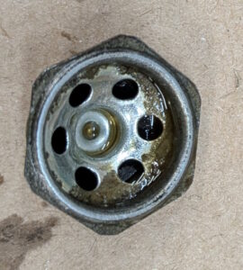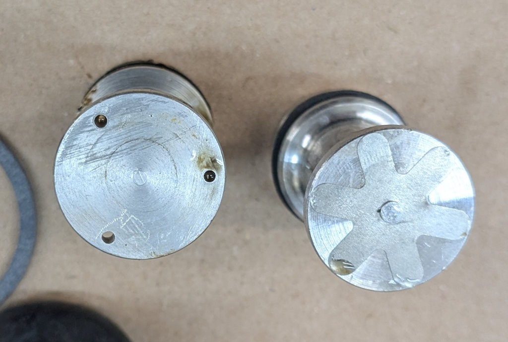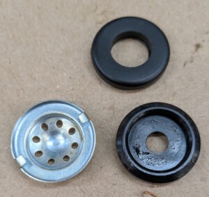 This is then residual pressure valve, which we need to not use in the rebuild. It is two cones of metal with a rubber valve between them. I think it works like the check valve in an oil filter. But the two parts below are what came with the new kit. One metal cone with fingers on the back and a strange rubber washer. I could not figure out how to put these two together to get anything that looks like it would be a valve. The rubber washer up above was the one that was in the MC before.